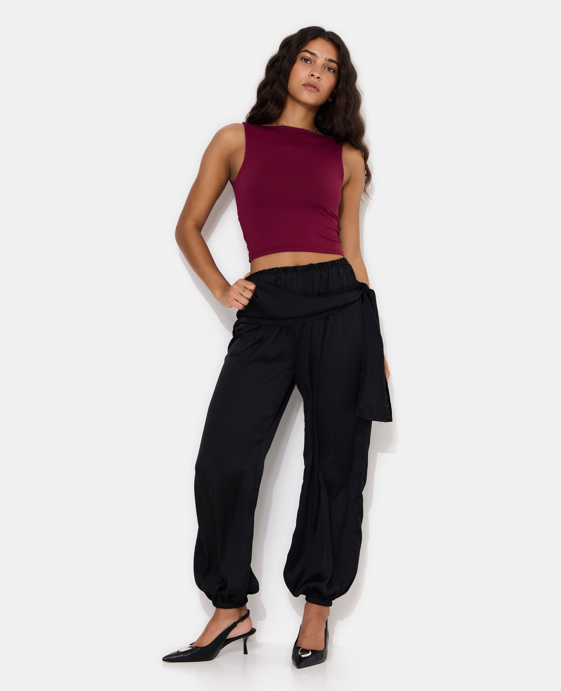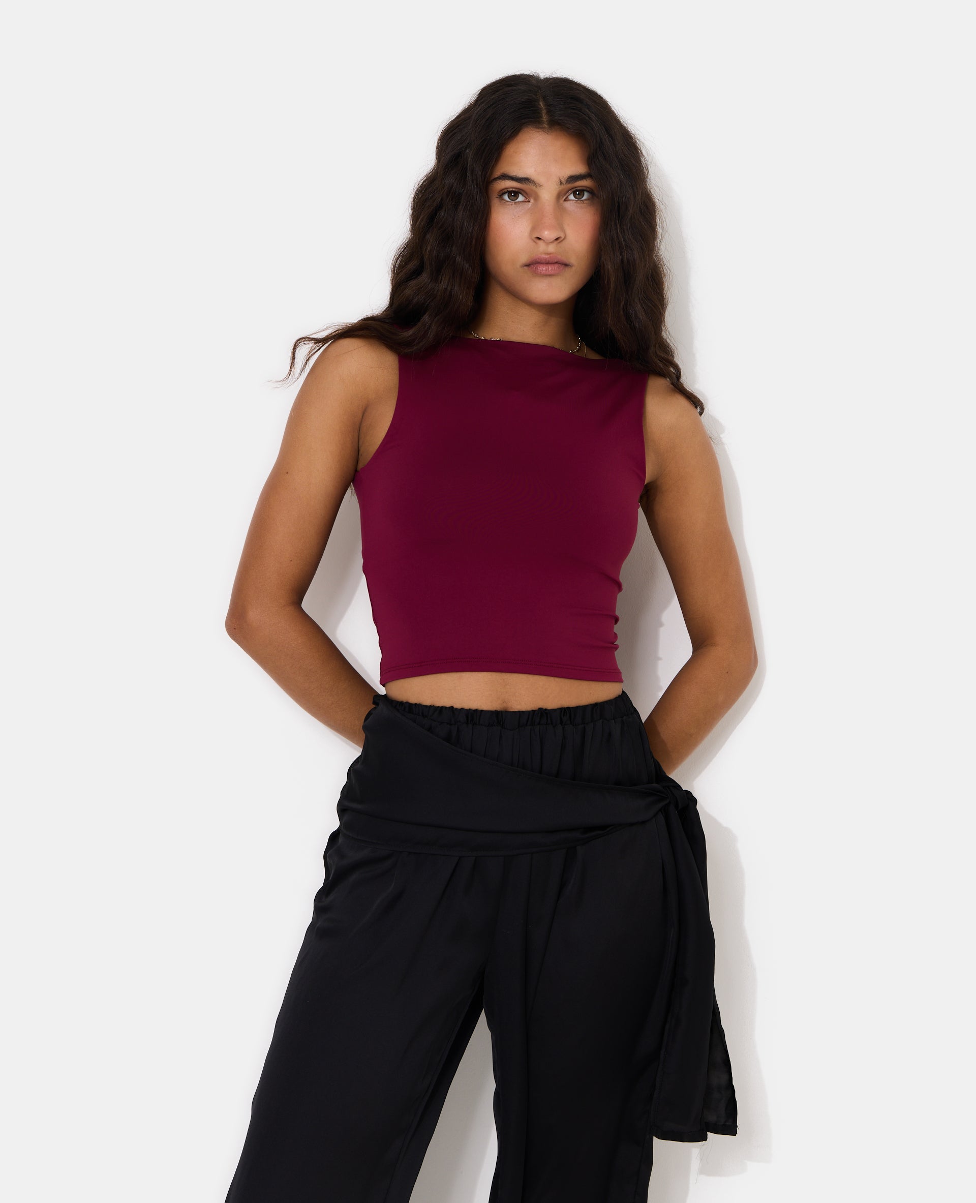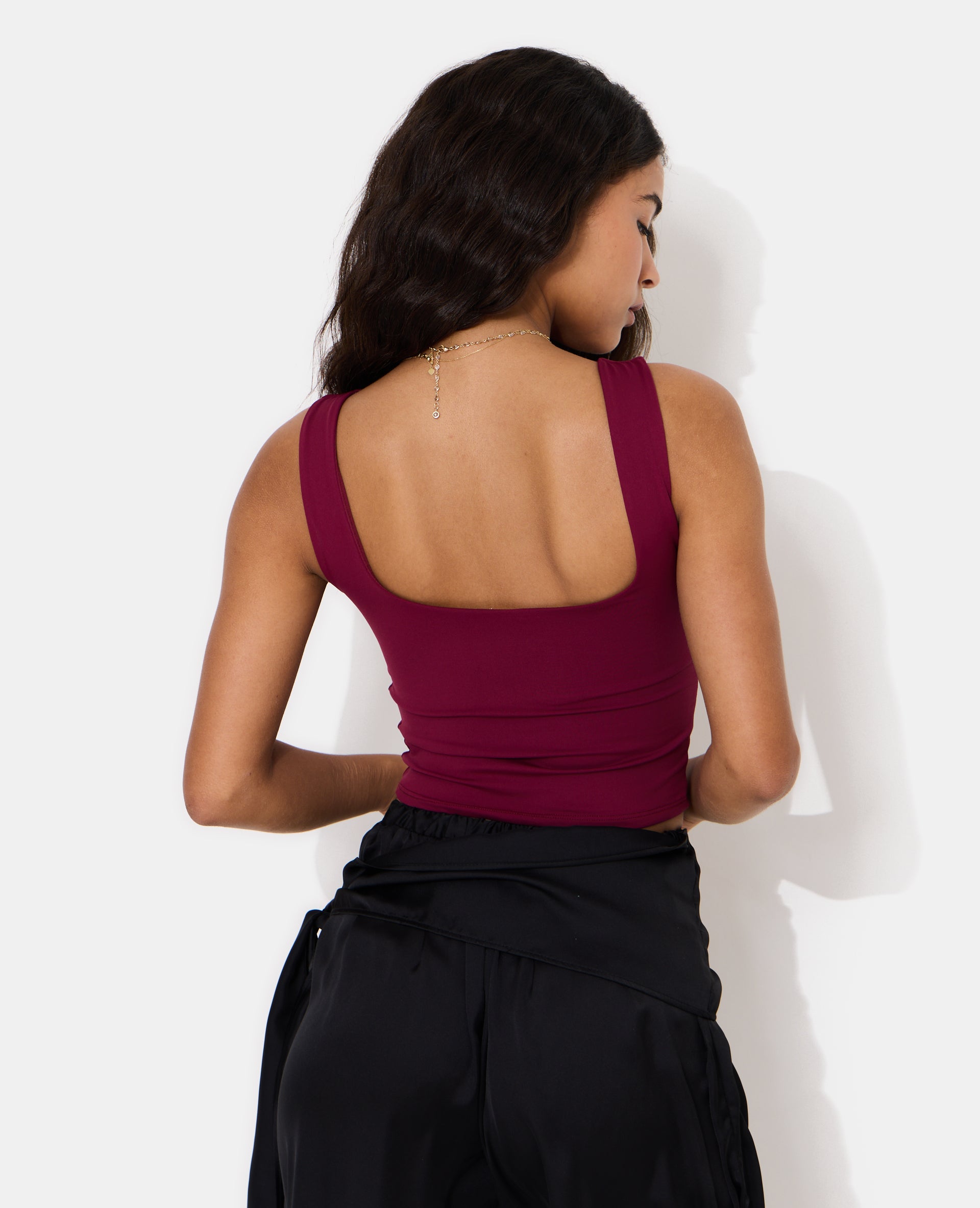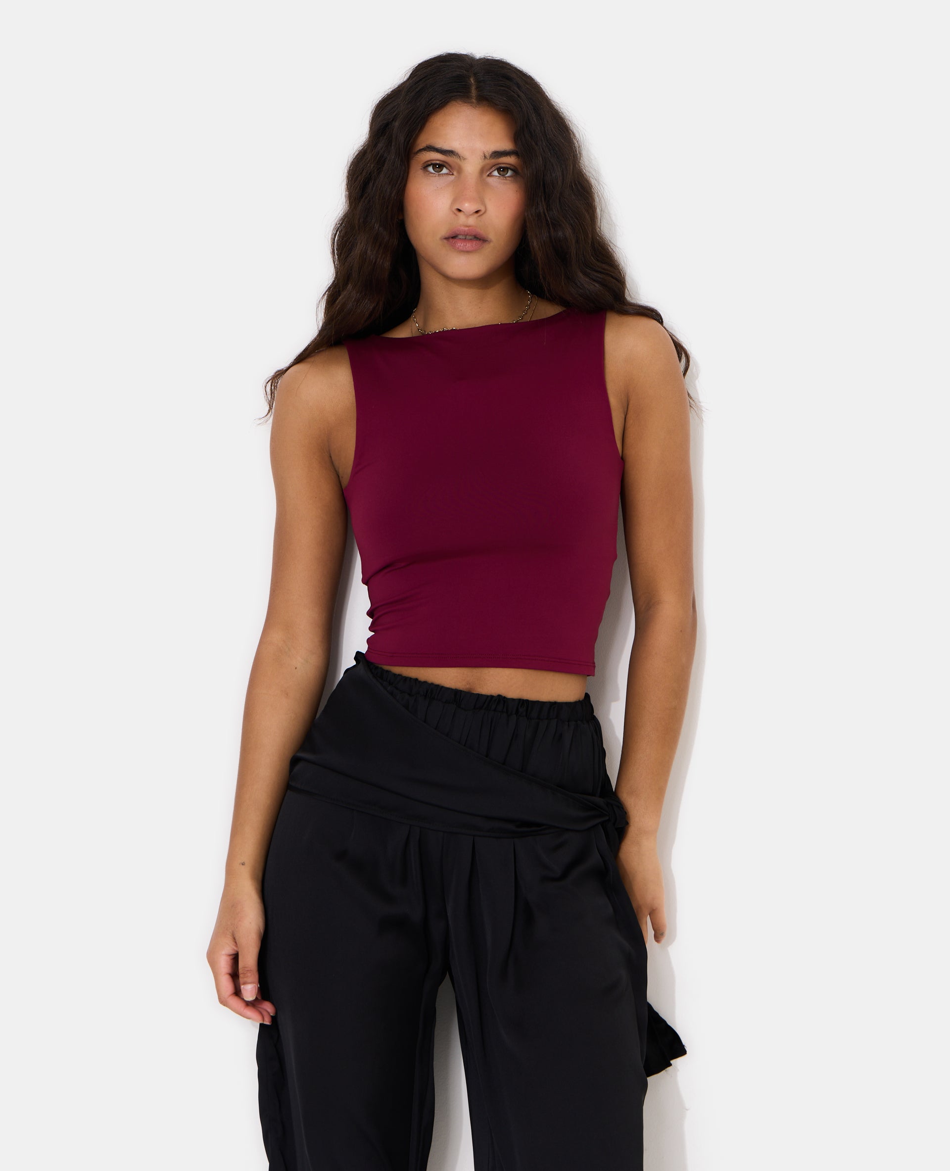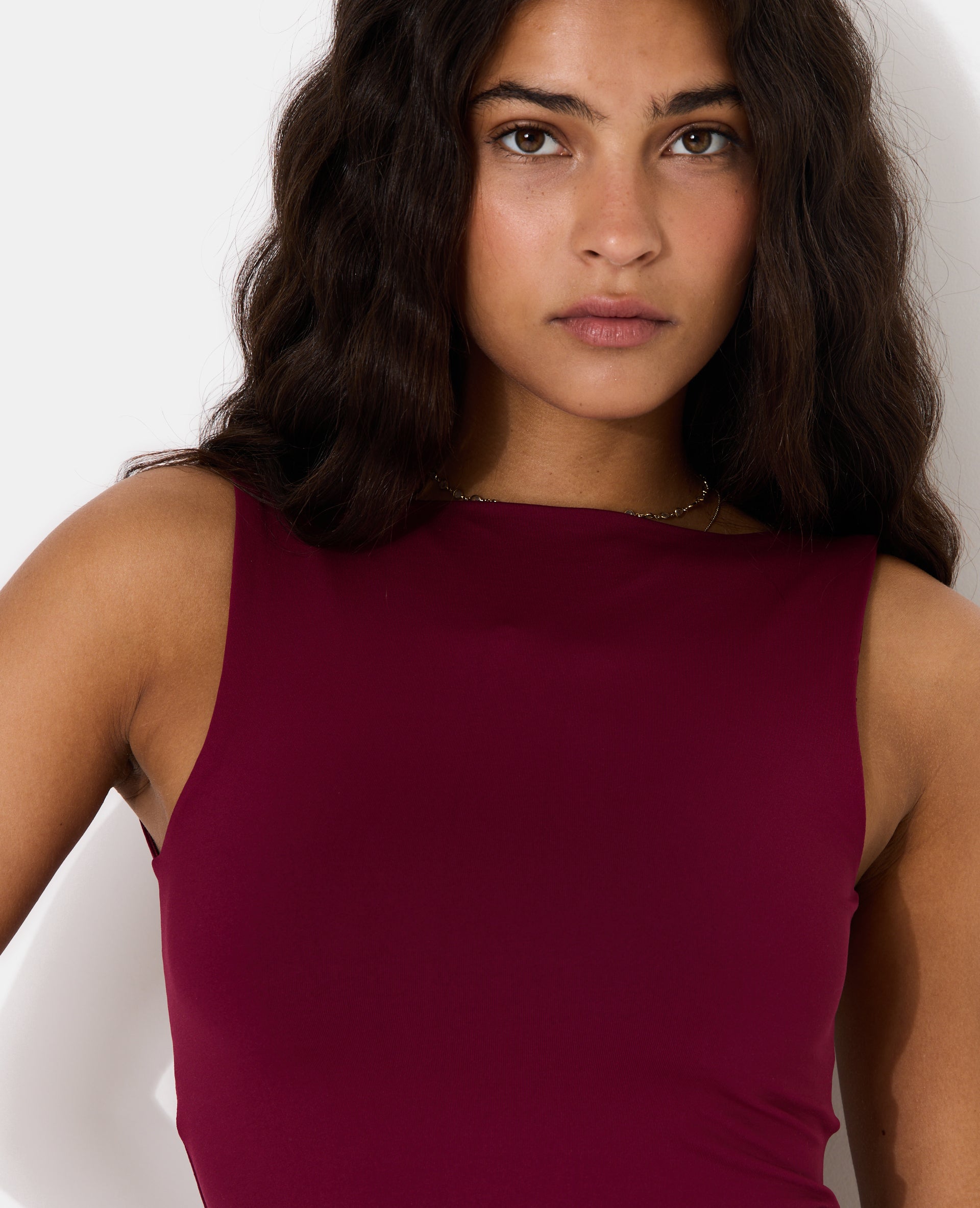 - Débardeur bordeaux en maille extensible.