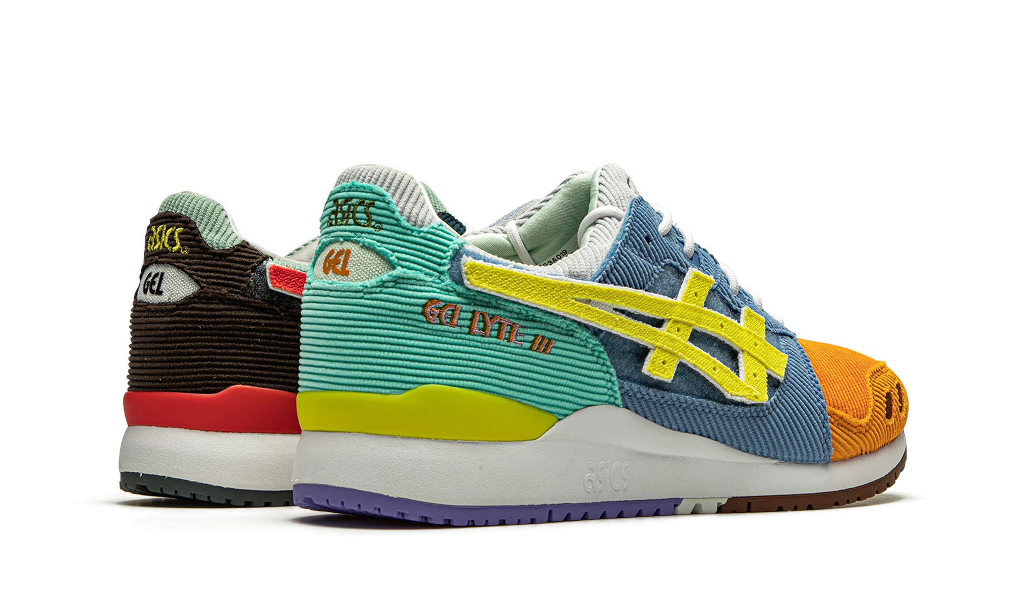 Experience the vibrant Sean Wotherspoon x atmos x Gel-Lyte III collaboration. This Summer 2020 release showcases Wotherspoon's signature style with customizable patches and a bold, mismatched color scheme reminiscent of 2000s Japanese streetwear. Premium corduroy paneling and the iconic split tongue design highlight this unique and eye-catching GEL-Lyte III.