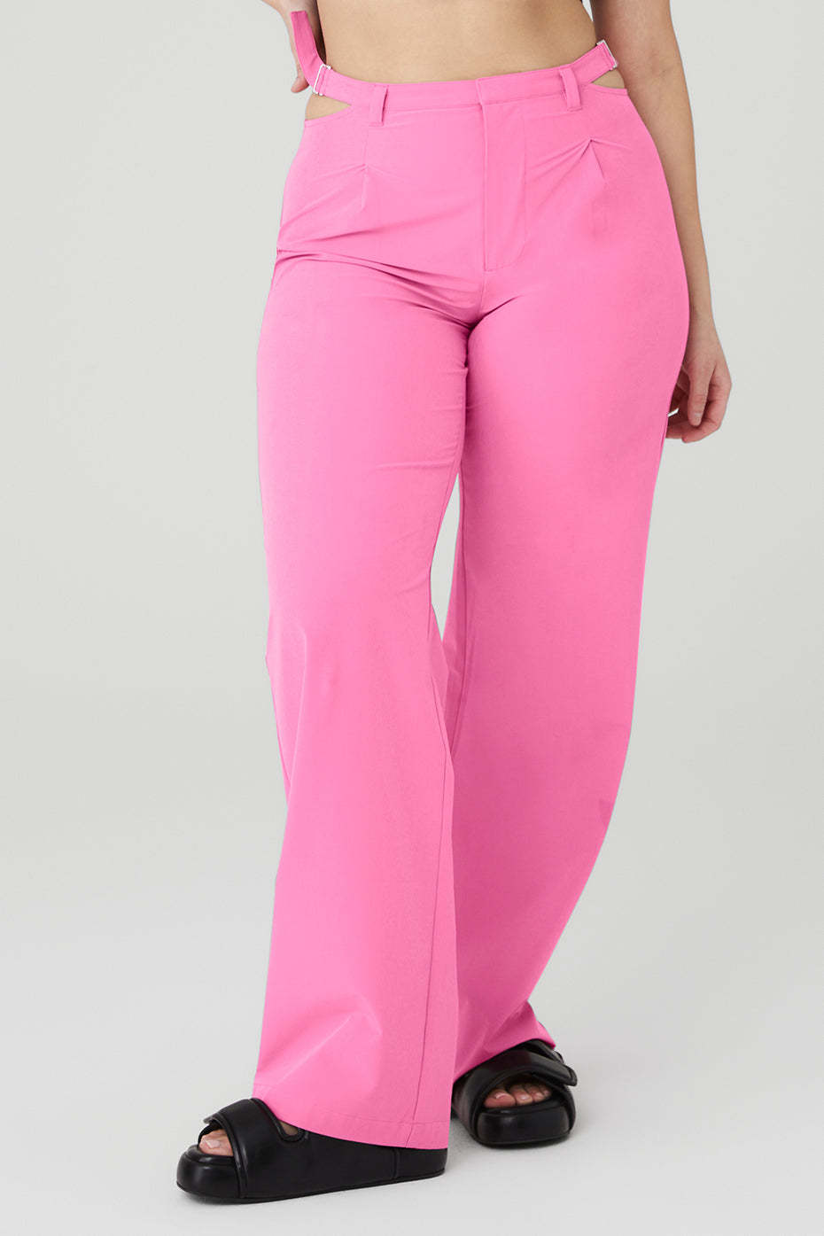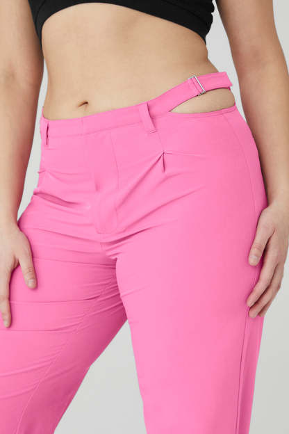 The Mid-Rise Showdown Trouser takes the best parts of a straight leg trouser and elevates it with on-trend hip cut outs and adjustable side belt buckles. This work-to-street-ready stunner is made from lightweight woven fabric and features faux back welt pockets for a sleek, forward finish. Style it with a cool crop or pullover.