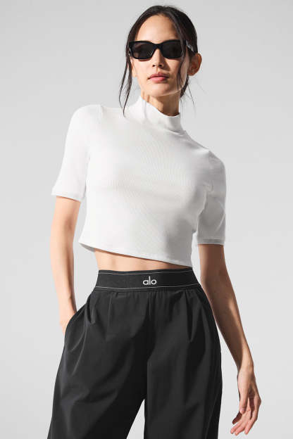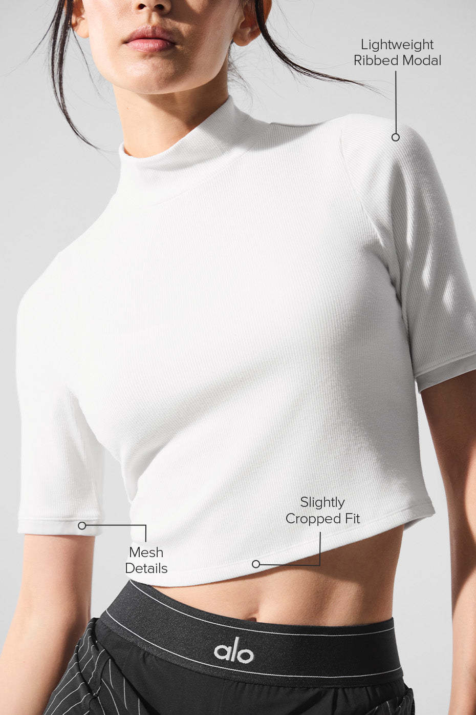 This classic silhouette is getting a cute little twist. The Ribbed Mesh Secret Short Sleeve is a classic mock neck tee with subtle mesh details athtlong the sleeves. This style is made from a lightweight and stretchy ribbed modal fabric, making it ideal for everyday wear.