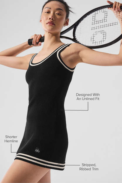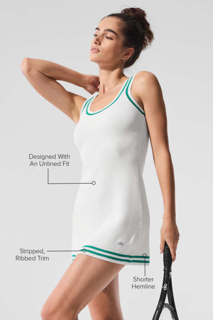 Score the country-club-chic look in this dress. It has striped trim, a simple scoop neck, and a body-skimming fit that nips in at the waist before easing into an A-line skirt with a mid-thigh-length hem. The fabric is lightweight, softly textured, and has a touch of stretch. Serve looks on the streets (with the matching Tennis Club Cardigan over your shoulders) or on the court (with the 3” High-Waist Airlift Shorts underneath).