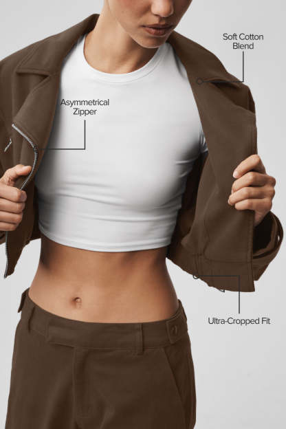 Minimal at first glance, considered in every detail. The Cropped Cosmopolitan Jacket features a shorter length that creates a sharp, flattering proportion, while the asymmetrical zipper brings an unexpected twist. Crafted from a soft cotton blend, this style was made for an off-duty look that feels intentional without ever being overdone.