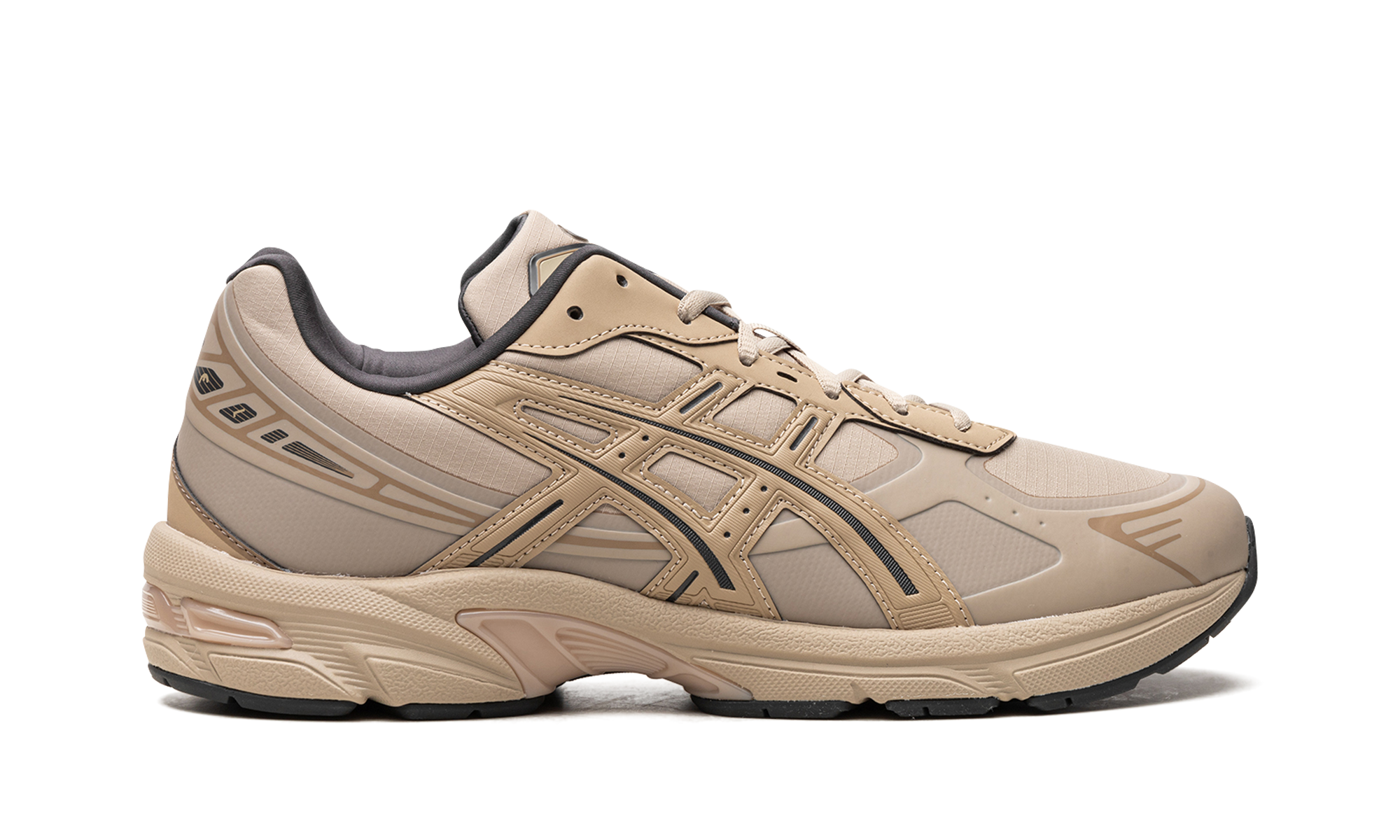 The Gel-1130 NS "Wood Crepe" is a mostly monochromatic tan colorway of the retro running shoe made from recycled materials. The Gel-1130 NS features no-sew overlays and is made with at least 20% eco-friendly materials to reduce waste and carbon emissions. The upper features a Wood Crepe appearance and black accented “tiger” stripes on the sides. Underfoot, Gel cushioning inserts in the midsole provide a comfortable ride. The Gel-1130 NS is a popular shoe in the Y2K-style sneaker trend.