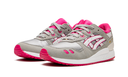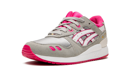 The Gel-Lyte 3 takes a third-generation heritage runner and gives it unbeatable style and comfort. Colored with hues of light grey, white, and bright pink, the low-profile kids' sneaker is made with premium suede and waterproof overlays that are ready for any weather condition. Most of the shoe carries the neutral colors, while pink accents the collar, tongue, tiger stripe outlines, and sole. The Gel-Lyte 3 running sneaker comes equipped with its famous Gel technology cushioning, a silicone-like material that absorbs shock and protects from high-impact strikes.