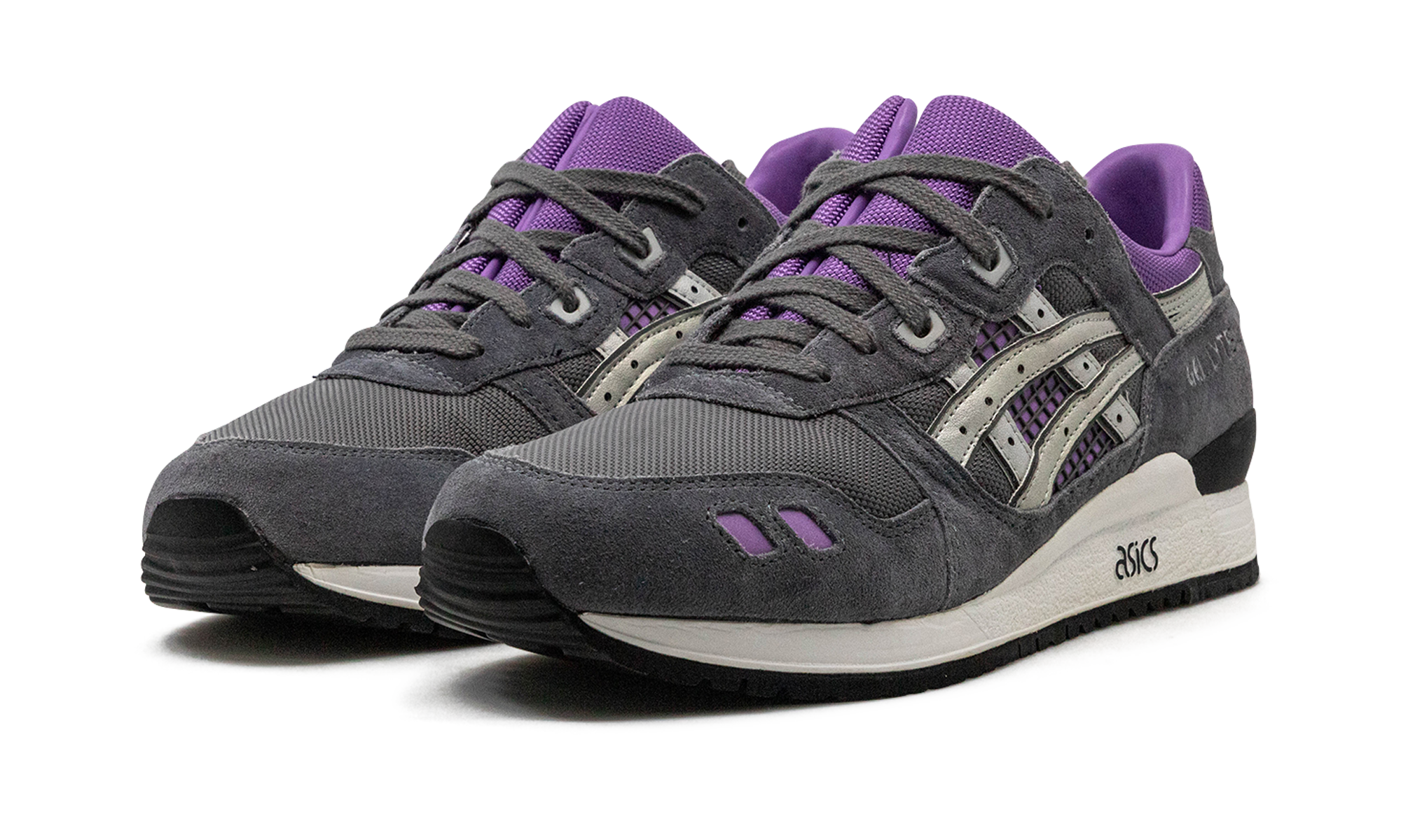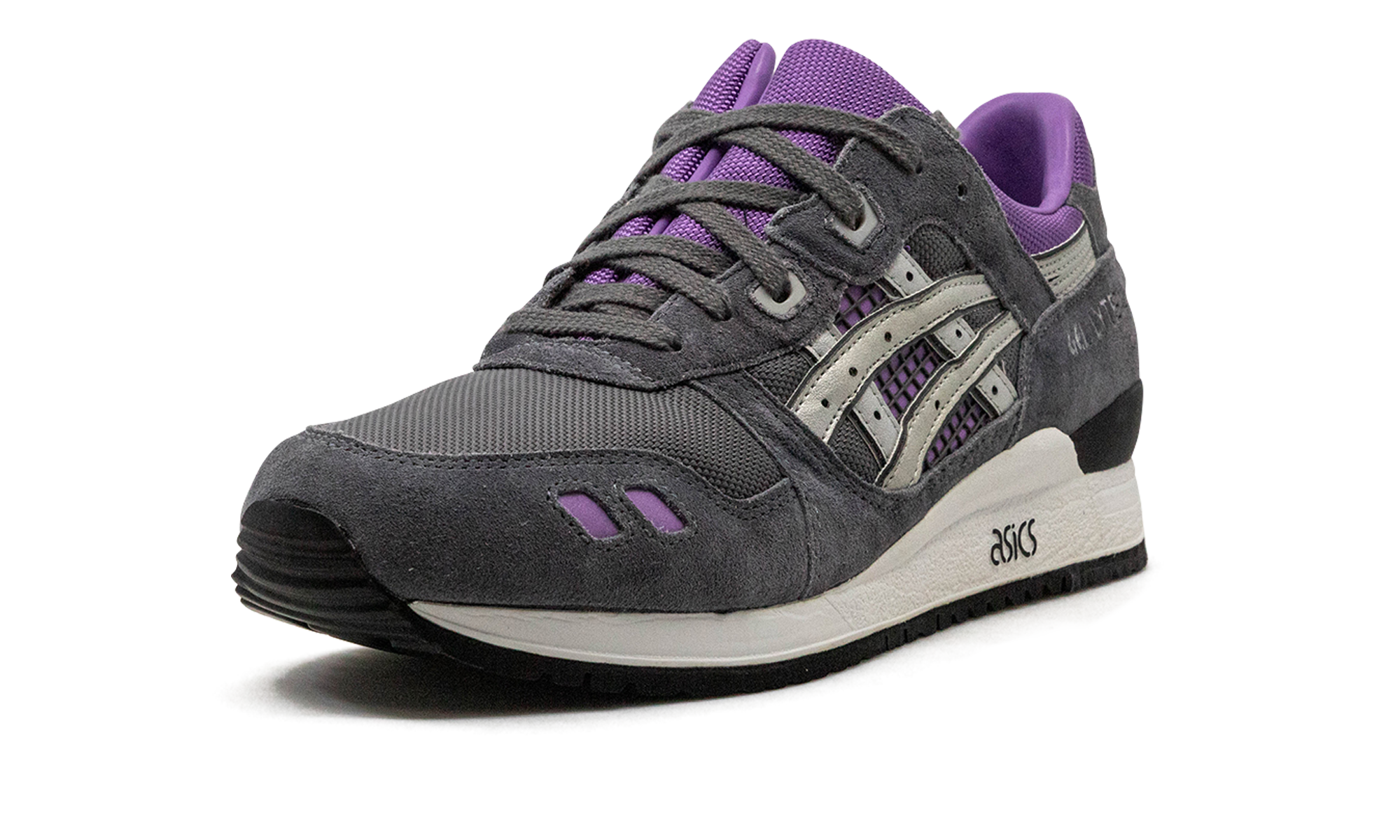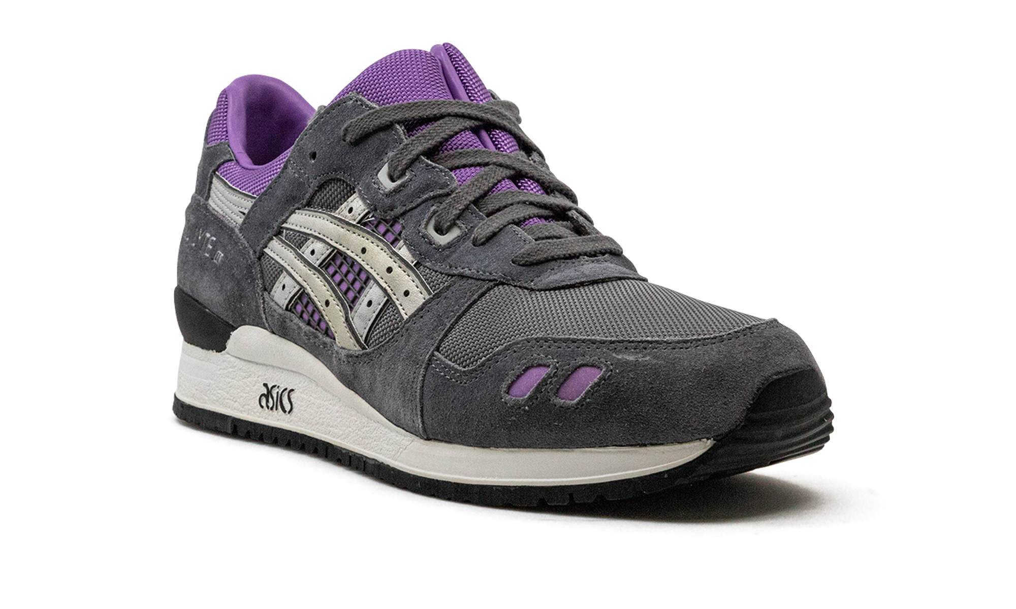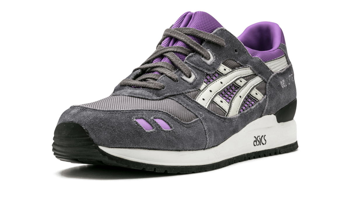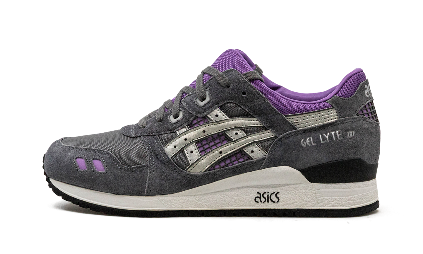 This version of the Gel-Lyte 3 features the comfort and support the Gel-Lyte is known for within an electric colorway featuring accents of purple and silver on a grey upper. A white midsole has a clean "" logo square in the middle.