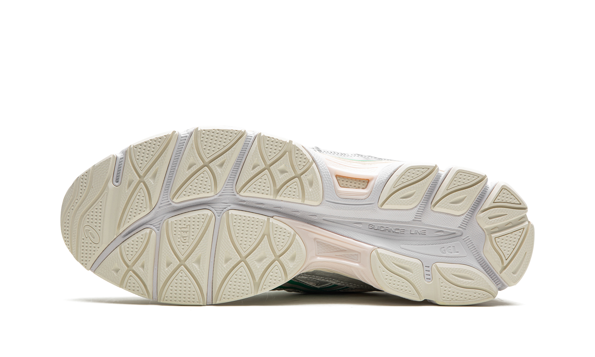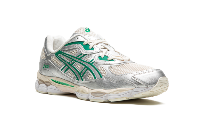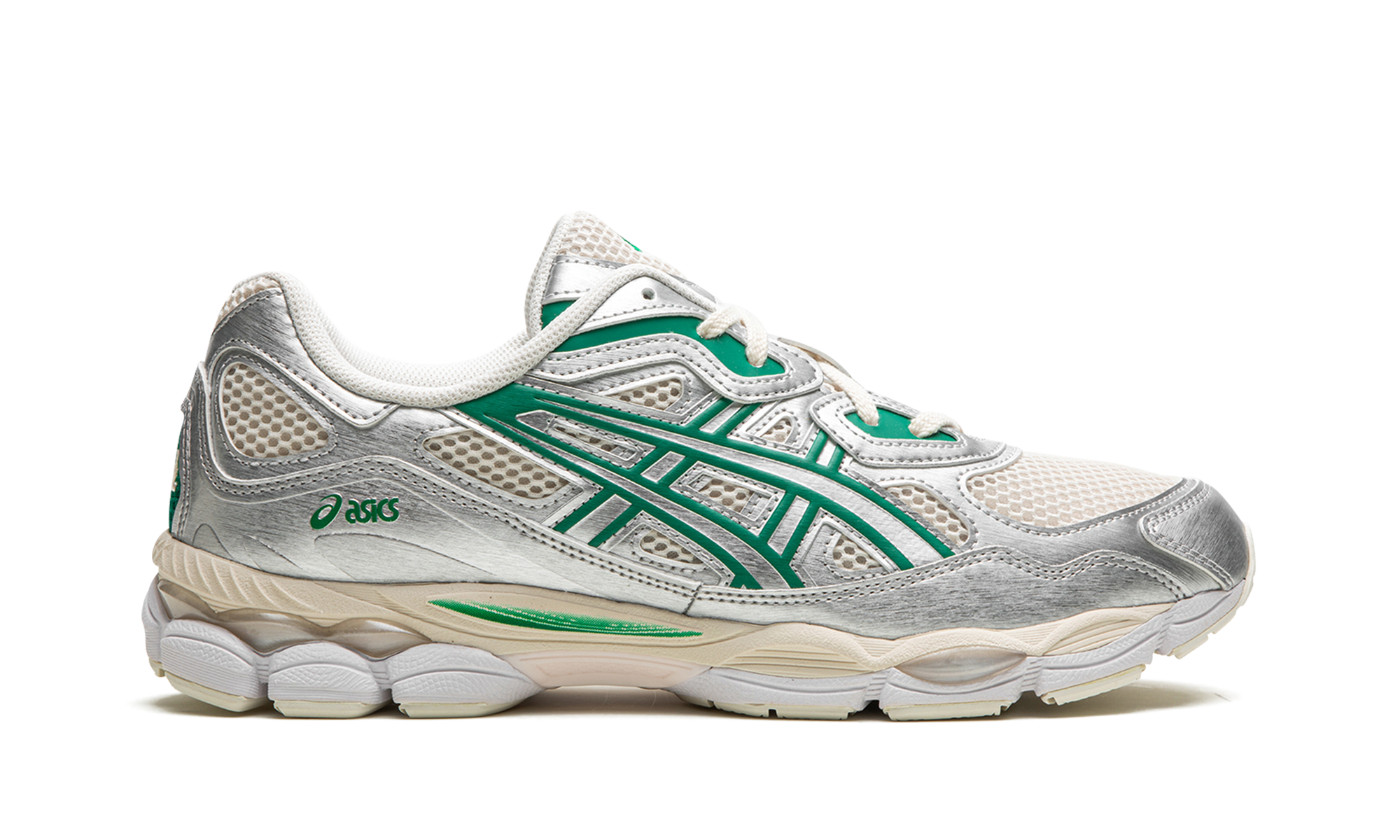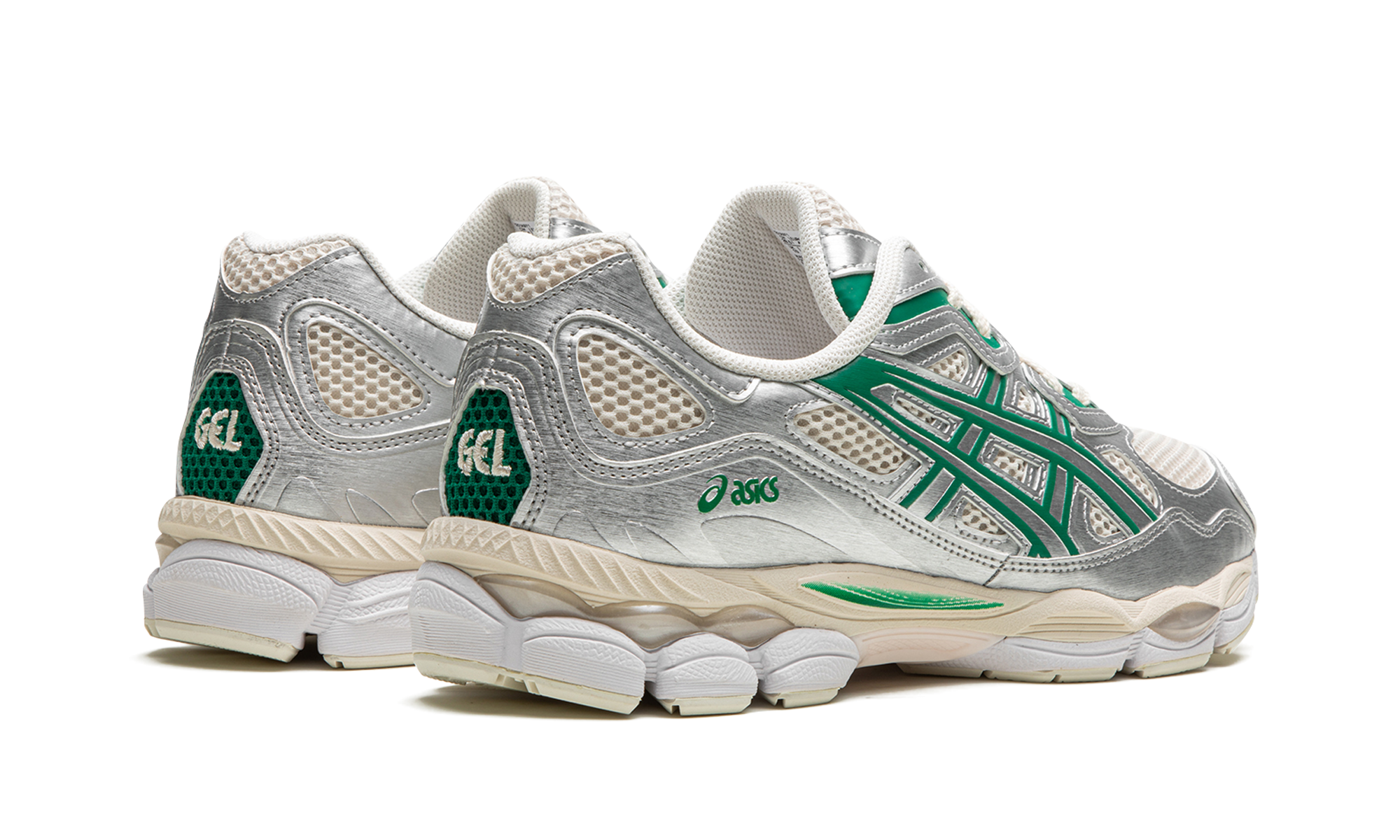 The Gel-NYC "Cream/Kale" is a colorway of the lifestyle shoe inspired by the brand’s heritage performance running sneakers with a flashy look. The GEL-NYC combines various design elements from different models, including the upper of the brand’s GEL-NIMBUS 3. The shoe features a cream mesh construction with Metallic Silver synthetic overlays on the toe and heel accented with Kale, or green, trim. Green branding appears on the sides. Underfoot, the shoe features tooling from the GEL-CUMULUS 16 running shoe. Release date: September 23, 2023