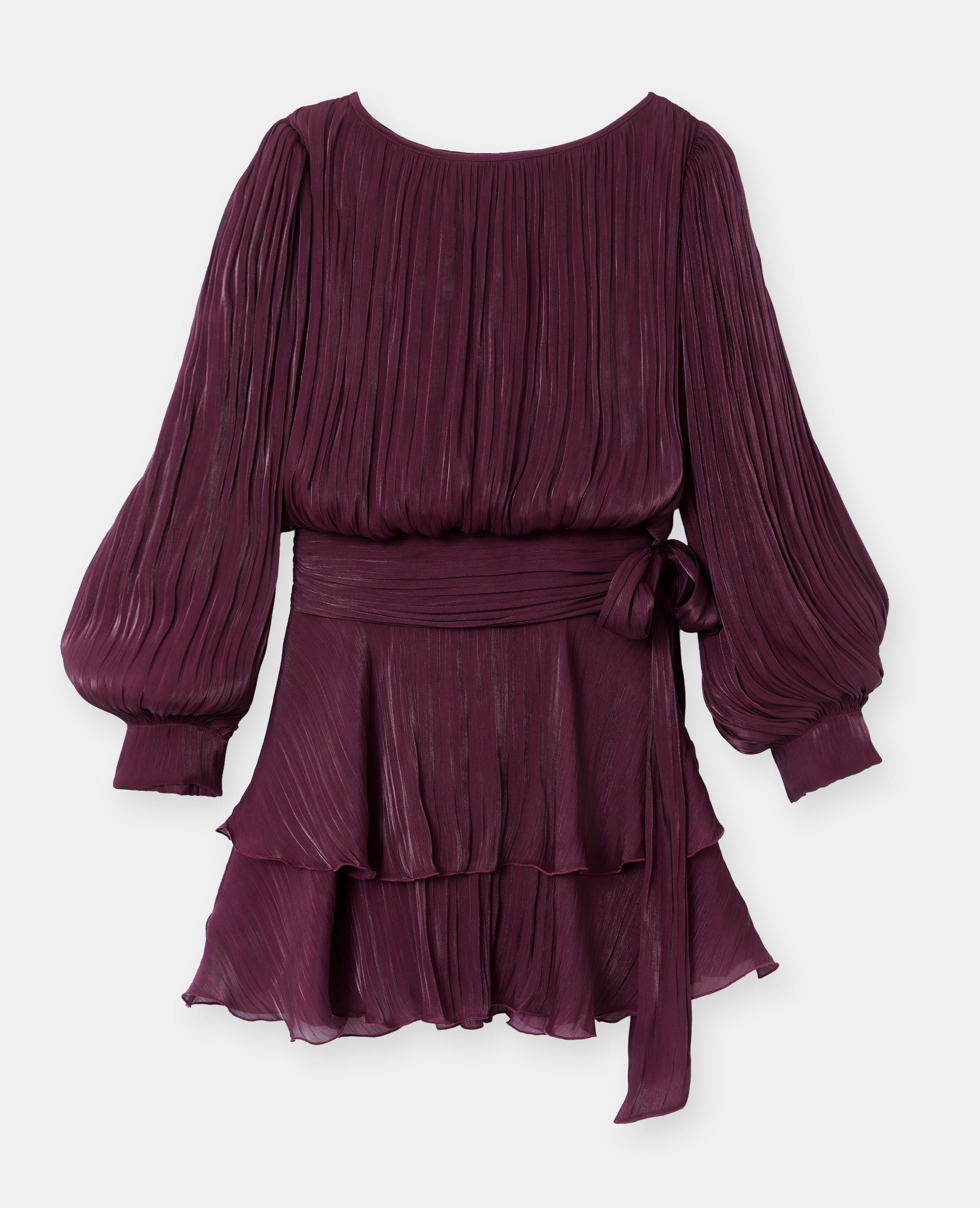 - Robe bordeaux en tissu brillant avec détails fronces pour un effet drapé.