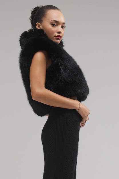 Yes—this faux fur vest is really as abundantly soft and fluffy as it looks on your screen. The boxy, cropped hem emphasizes the natural waist, and a stand collar and extended shoulders balance the look. Secure it with the hidden hook-and-eye closures, or wear it open to show off the slinky slip dress you’ll wear underneath.